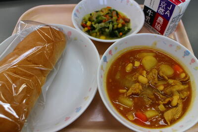 全粒粉パン 牛乳 カレービーンズ 野菜ソテー