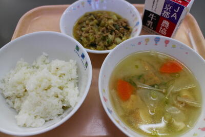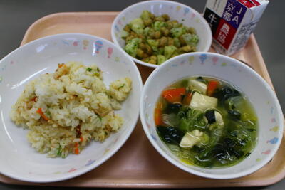 五目チャーハン 牛乳 のり豆ポテト 春雨スープ セレクトデザート