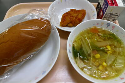 パン 牛乳 ミートサンド ウインナーと野菜のスープ スイートポテト