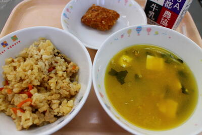 鶏飯 牛乳 シイラの竜田揚げ かぼちゃのみそ汁