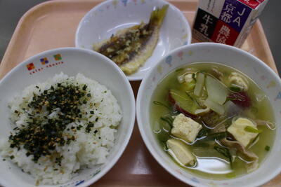 ごはん 牛乳 カマスのからあげ さつま汁 ふりかけ