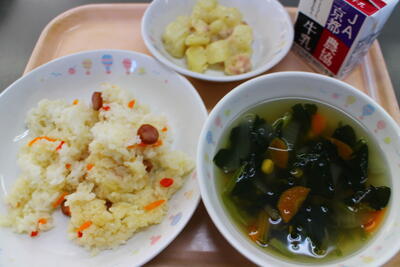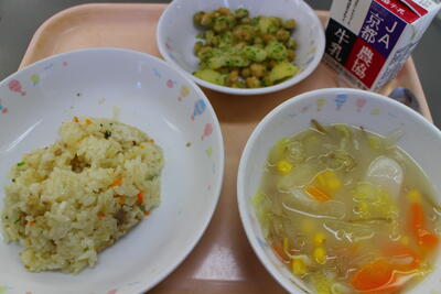五目チャーハン 牛乳 のり豆ポテト みそトックスープ