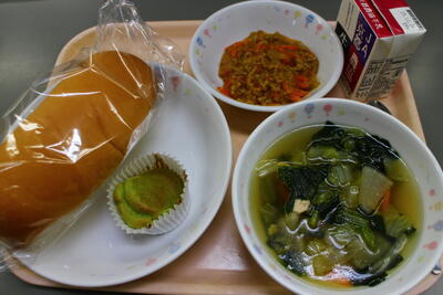 ミルクパン 牛乳 カレーミートサンド 冬野菜スープ 舞鶴抹茶のカップケーキ