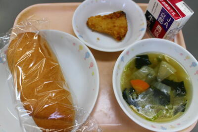 全粒粉パン ぎゅうにゅう ハマチのフライ 冬野菜スープ