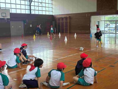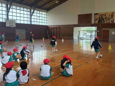 ボールを扱うのは手でも難しいところがありますが、足となればもっとたいへんです!コーンを回って帰ってくるのですが、あらぬ方向にボールが・・・。そのたびに体育館は大笑いに。ボールと足がぴったりいきますように。