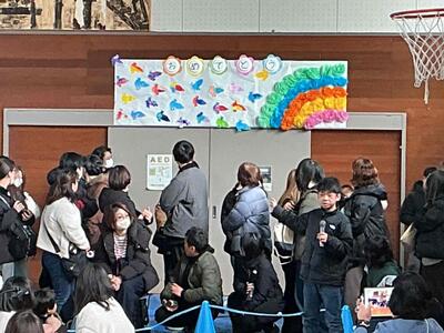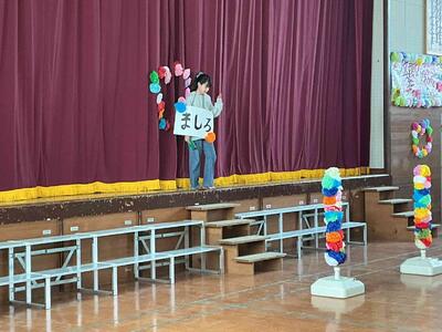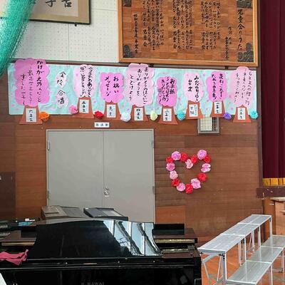 会場は各学年が分担して作成した素敵な飾りに彩られました。6年生一人一人にメッセージや名札も作成しました。そうした心のこもった贈り物を紹介しました。