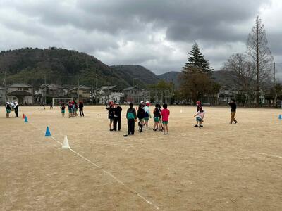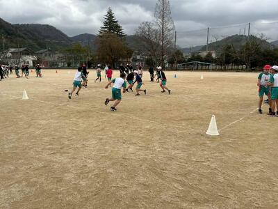 腰に付けたタグをとられないように相手ゴールまでボールを運びます。作戦を練って、決めた通りに動いて、相手を惑わします。うまくかわしてゴール(トライ?)できたら爽快感いっぱいです。