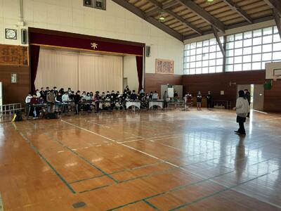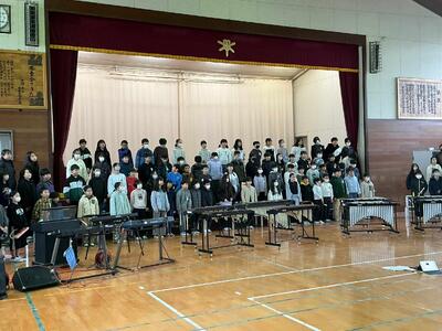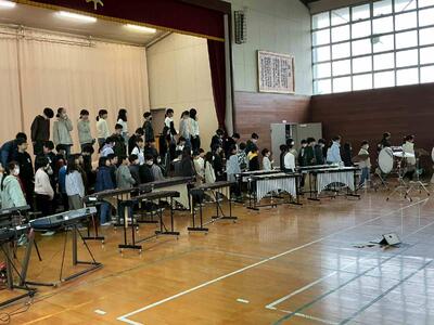 大編成の合奏です。たくさんの楽器が並んでいて音を揃えるのは、なかなか大変ですが、個人練習も取り組んで全体でよい合奏にしようとがんばってきました。体育館で全体の音色を揃え、仕上げていきます。