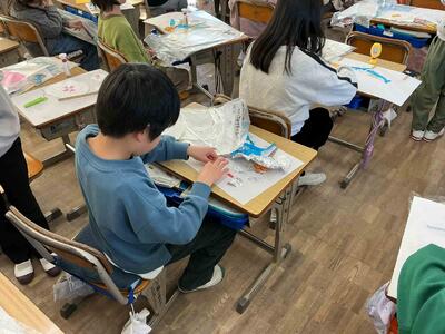 ひもやリボン、アルミ箔や段ボールなど、様々な面白い素材をいかして、作品をつくります。貼り付けていって形を表したら、紙版画の作品として仕上げます。面白い作品がたくさん出来上がりそうですね。