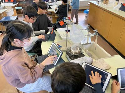 実験は、班やグループで行うことが多くて友達と一緒に活動できる楽しいものです。楽しく実験をしたら、実験からたくさんの学びを得ていきましょう。タブレットも活用して、実験結果をしっかりまとめます。