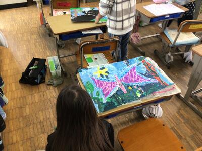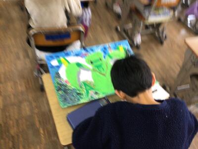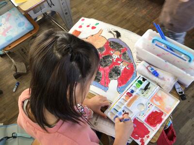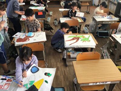 「虫となかよし」をテーマに絵に取り組んできました。いよいよ彩色、色付けに入っています。なかよしになる虫をよりよく表現するためにあざやかな色あいで彩色しています。絵の具の混色を上手にして、あざやかな色が出せているようです。
