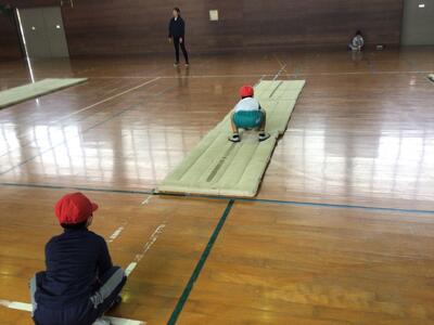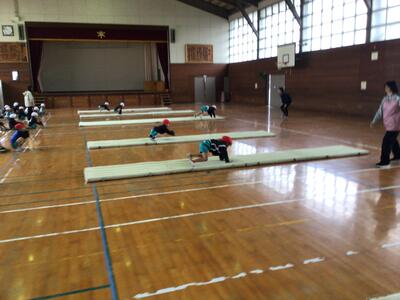 1年生がマット運動に取り組んでいます。まだマット運動まで進む感じではなく、マットを使って様々な動きを試していきます。カエルやウサギになったように、ぴょんぴょんぴょこぴょこ。楽しみながらいい動きを身に付けましょう。