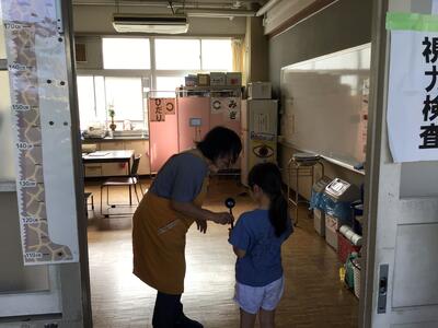 よ~く見て 10/17 (1年生) 投稿: 学校管理者 (10/17) 10月10日は目の愛護デーです。その時期に合わせて視力検査を行っています。この日は1年生が検査に臨んでいました。黒いお玉のような道具で片方の目を隠すのはおなじみです。よ~く見て答えて、目の状態を確かめてもらいましょう。