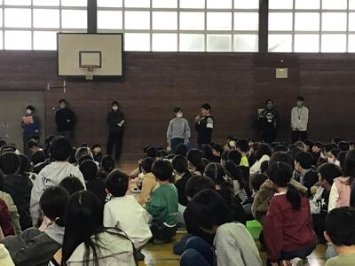 12月に向けた中筋タイムを行いました。12月の月目標を児童会本部役員が提案しました。後期児童会本部役員にとって2回目の機会と言うことで1回目より成長した姿を見せてくれました。続いて3年1組が総合的な学習で学んだことを発表しました。万願寺唐辛子について調べて分かったことをクイズを交えて紹介してくれて、会場は大いに盛り上がりました。次に集会委員が伝言ゲームと猛獣狩りへ行こうよゲームを進めてくれました。虹グループごとにゲームに参加してこれも児童全員でたくさん楽しみました。終わりの挨拶では、みんなのメリハリのある聞き方を評価する声がありました。最後は2年生の鍵盤ハーモニカの演奏にのって退場となりました。前回に引き続き、終わりの挨拶にもあったように、メリハリのある参加の仕方でよい中筋タイムになりました。
