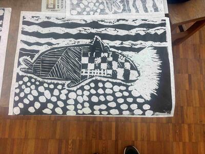 刷ってみました 12/12 (4年生) 投稿: 学校管理者 (12/12) 刷ってみました!版画です。インクをローラーで版木にたっぷりつけて、版画用紙を重ねて、こすると絵が写し取られました。これはなかなか感動する瞬間です。用紙の裏面から絵の具で色を付けて、多色刷り版画に仕上げていきます。
