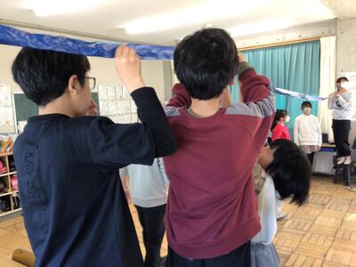大胆にも 12/19 (6年生) 投稿: 学校管理者 (10:57) 大胆にも、教室でバレーボールをしています。といっても風船バレーですが。ネット代わりにテープでしょうか、教室の端から端までをわたしてあります。よく見ると子どもたちがテープを支えています。手作り感満載で楽しいですね。
