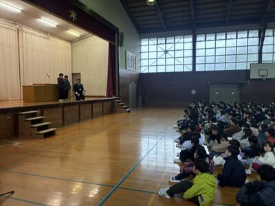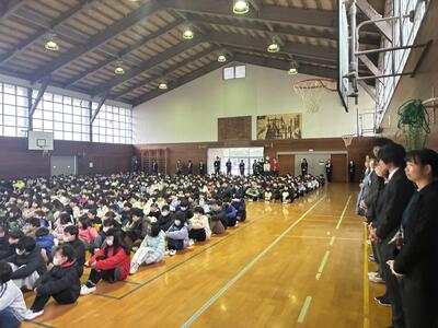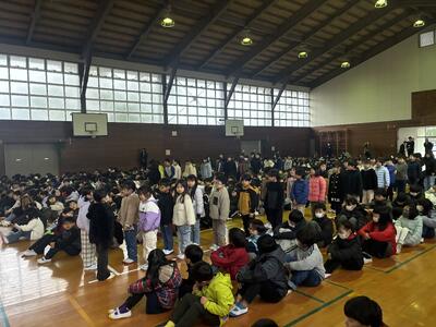 中筋2026スタート! 投稿: 学校管理者 (01/08) 中筋小学校2026がスタートしました。始業式に全校児童が集まりました。あいにくのみぞれまじりの天候となりましたが、子どもたちが学校に戻ってくるとやはり活気にあふれて、嬉しい限りです。教室に戻って3学期の目標を定めて、充実した学校生活を送れるようにがんばりましょう。