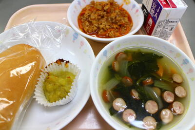 パン 牛乳 ミートサンド ウインナーと野菜のスープ スイートポテト