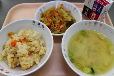 こぎつねごはん 牛乳 高野豆腐の野菜炒め たまねぎのみそ汁