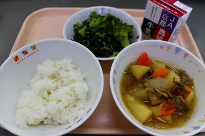 ごはん 牛乳 まいづるの肉じゃが ブロッコリーとしらすとわかめのごま和え