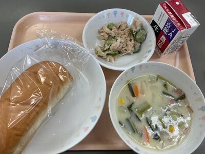 4月17日 給食 投稿: 学校管理者 (04/17) 【今日のこんだて】 パン 牛乳 ツナサンド チンゲンサイのクリームスープ 昨日から1年生の給食がはじまりました!今日は2日目で、昨日よりもスムーズに準備を行うことができました。給食ボランティアに参加していただいた皆様、ありがとうございました。 クリームスープは、米粉を牛乳で溶いたものを入れています。チンゲンサイの他にも、野菜がたくさん入っています。