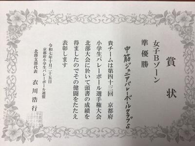 女子Bゾーン 準優勝 中筋ジュニアバレーボールクラブ